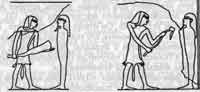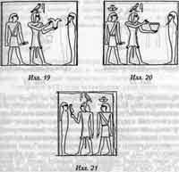 Лицом к нему, на цветке лотоса, находятся четверо "сыновей Хора (или Осириса)". Первый, Имсети, представлен с человеческой головой, второй, Хепи, - с головой обезьяны, третий, Дуамутеф, - с головой шакала, а четвертый, Кебехсенуф, - с головой сокола. Висящий рядом с лотосом предмет обычно считается шкурой пантеры1, но скорее это воловья шкура (илл. 6).