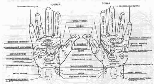 Рис. 11. Проекция opганов и участков тела на ладони (зоны манорунктуры)