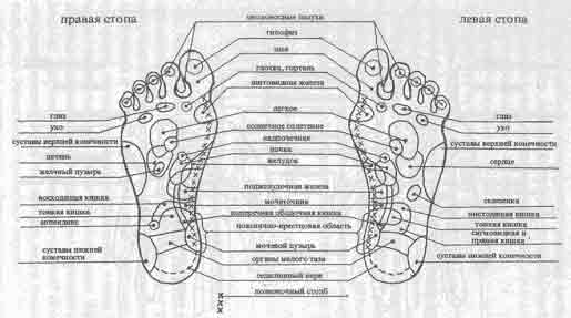 Рис. 12. Проекция органов и участков тела на поверхности стопы (зоны педопунктуры)