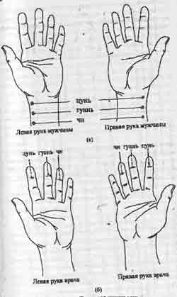на точку Цунь накладывается указательный палец, на точку Гуань - средний,