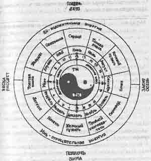 Рис. 16 Годичная и суточная циркуляция энергии в меридианах или активность и пассивность органовС 9 до 11 часов энергия переходит в меридиан поджелудочной железы. Нужно принимать антидиабетические средства, например, пить такой травяной настой: лист черники - 60 г, стручки фасоли - 60 г, галега - 40 г, лист грецкого ореха - 40 г, живокость высокая - 40 г, чернокорень - 20 г, цветы черной бузины -'- 60 г, семена конопли - 20 г, корень одуванчика - 40 г, золотой корень - 40 г. 2 столовые ложки сбора положить в термос и залить 400 мл крутого кипятка, настаивать 2 часа. Принимать во время максимума и минимума энергии в меридиане